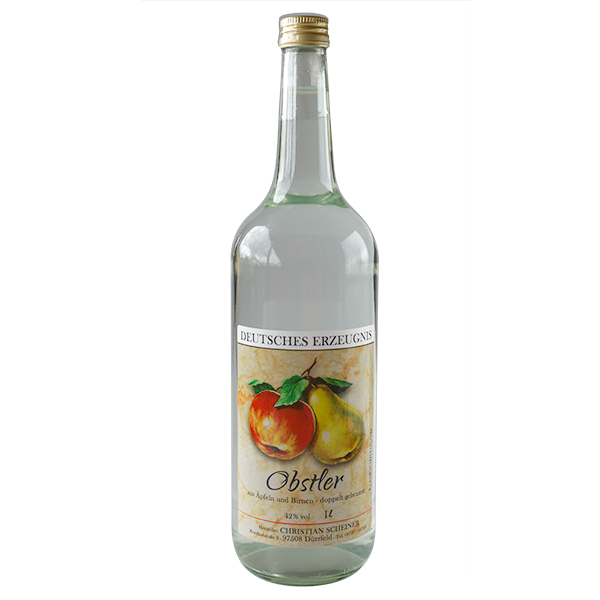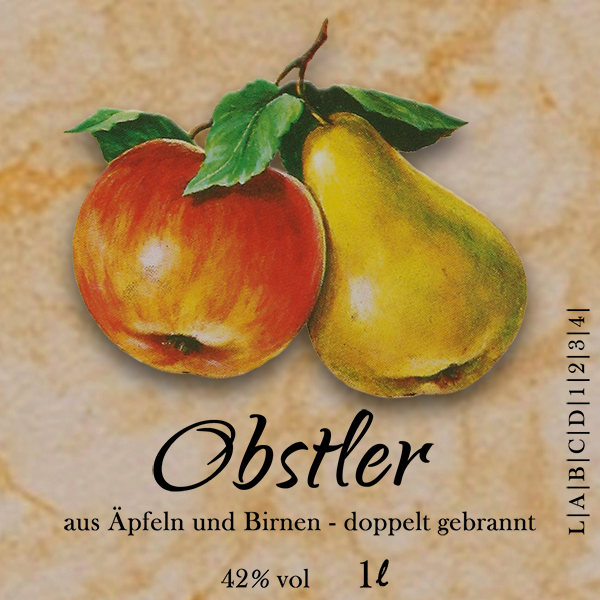 Der Obstler, ein Klassiker, doppelt gebrannt aus Äpfeln und Birnen mit 42 % vol. Der hohe Apfelanteil findet sich im Geruch und Abgang wieder.