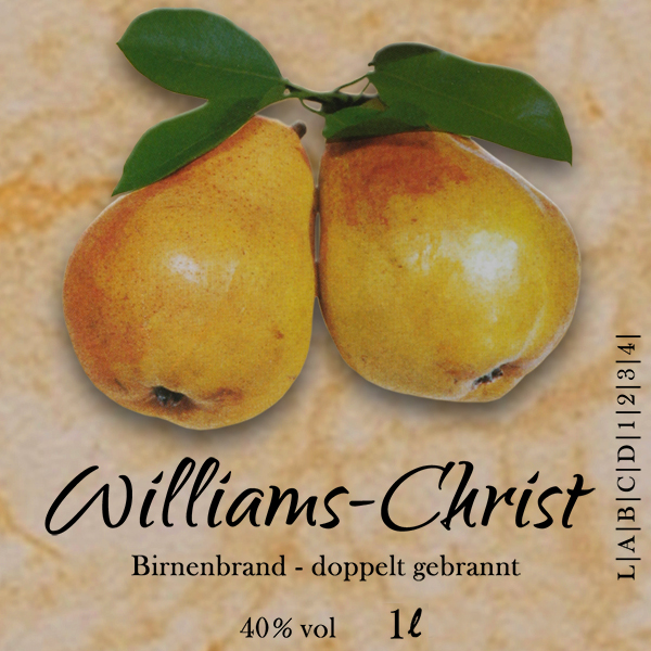 Der Williams Christ Birnen Brand mit seinen 40 % vol. ist das absolute Herzstück unserer Obstbrände. Nur die Destillation aus echten Williams Christ Birnen berechtigt zu diesem Namen.
